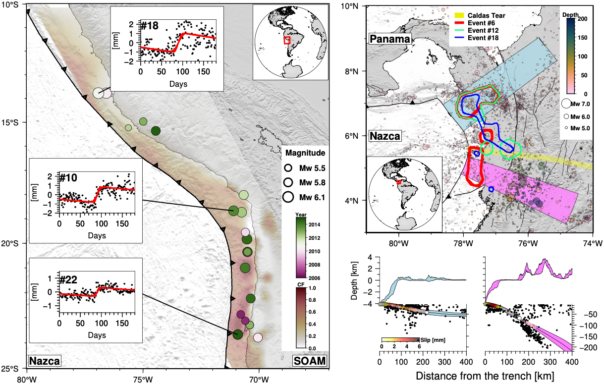 Figure 1. Left: Aseismic slip events in the southern Peru–northern Chile subduction zone. Right: Aseismic slip in northwestern Colombia.