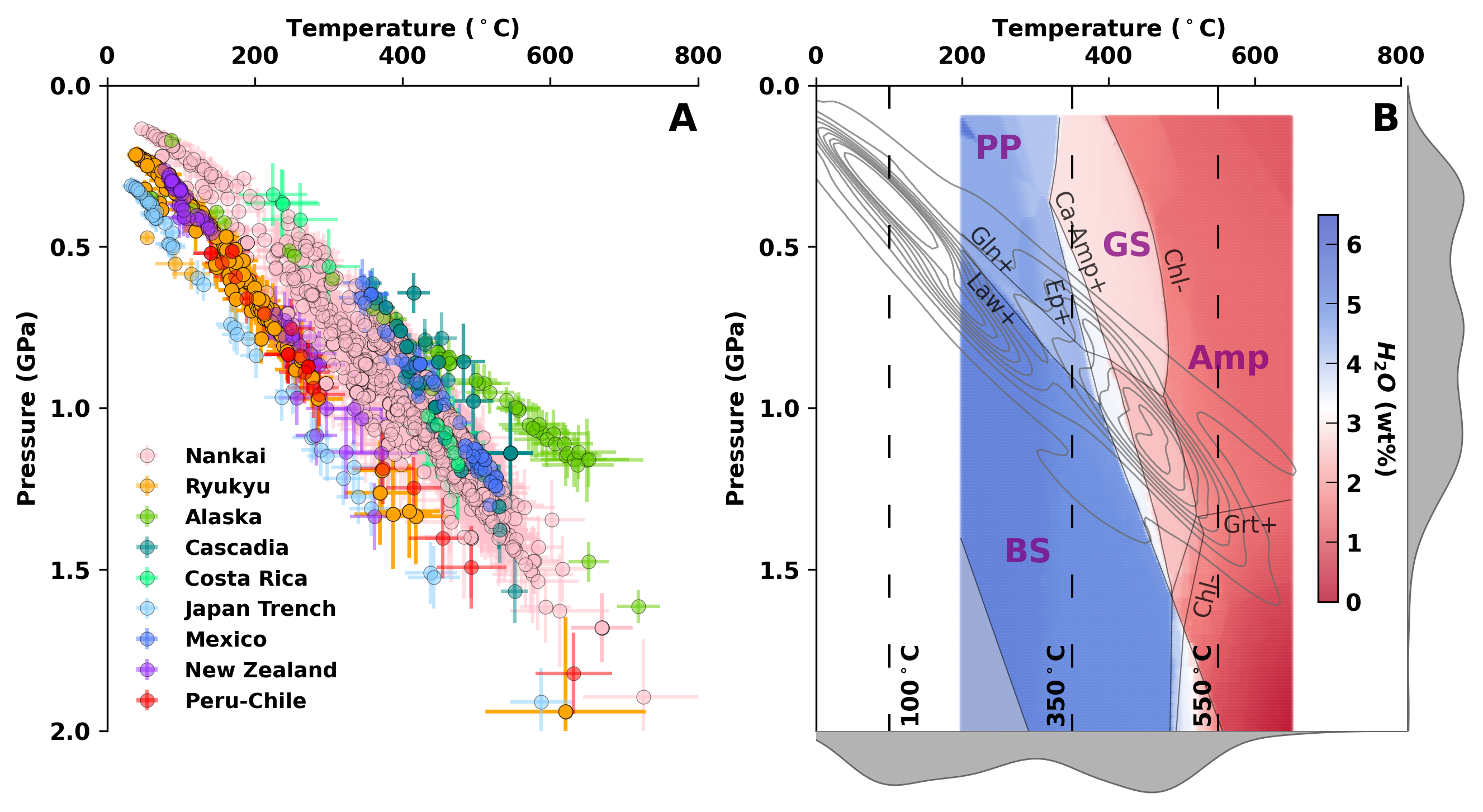 While the presence of aseismic slip is now well established, the physical mechanisms controlling it remain debated. My recent work has focused on evaluating three main candidates: heterogeneities in fault constitutive properties, stress interactions induced by geometrical complexities such as damage zones, and the role of fluids. By combining global slow slip event catalogs, thermal modeling, petrological constraints, and machine learning approaches, we find growing evidence that fluids released by metamorphic dehydration reactions play a key role in promoting aseismic slip by increasing pore pressure and reducing effective normal stress (Figure 2).