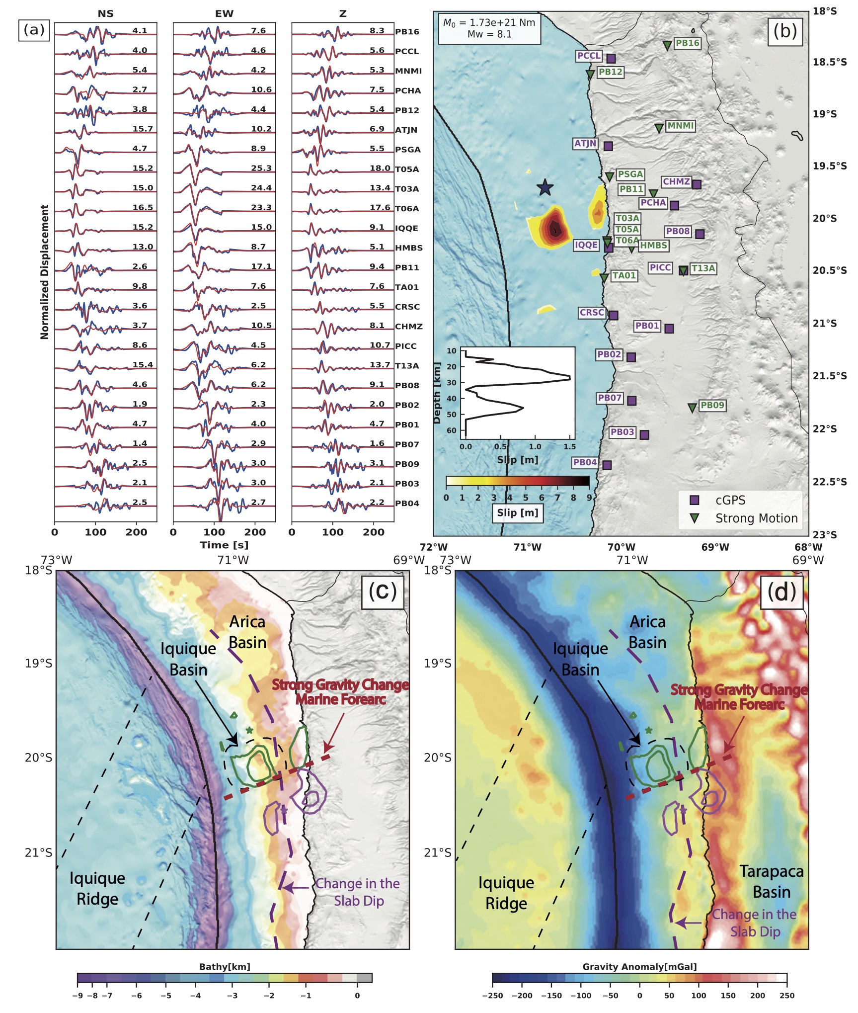 Figure 1. (a) Iquique EQ data (blue) and synthetic seismograms (red) with the kinematic slip model (b). (c) High-resolution topography and (d) free-air gravity anomaly. Mainshock (green) and aftershock (pink) slip contours are shown. The violet line marks the location of an abrupt change in slab dip.