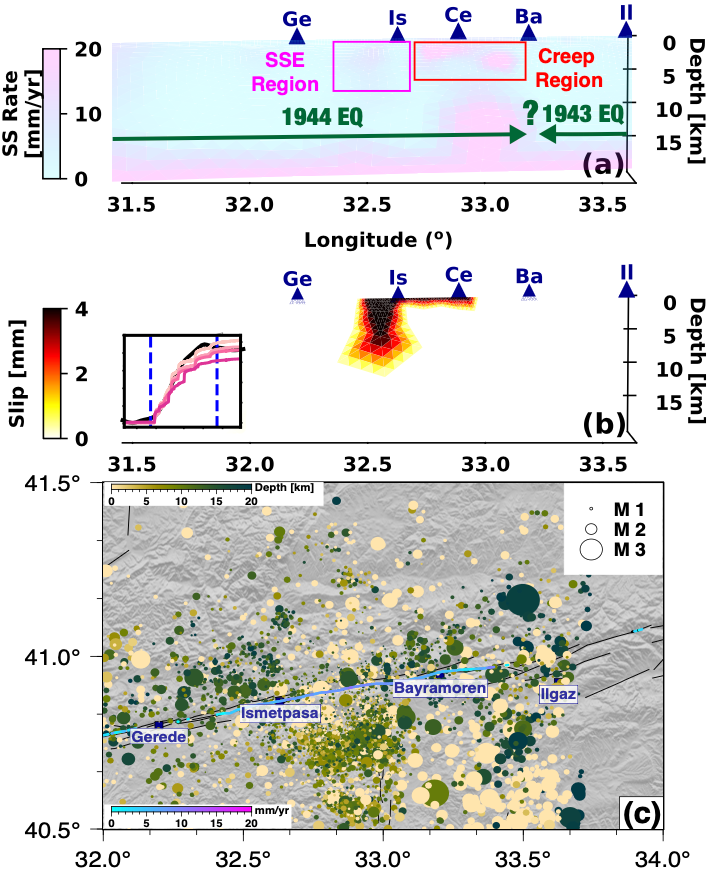 Figure 2. (a) Fault slip rate and (b) slip of the 2019 SSE in the NAF central section (Ismetpasa). (c) 2022–2024 EQ catalog from a local network.